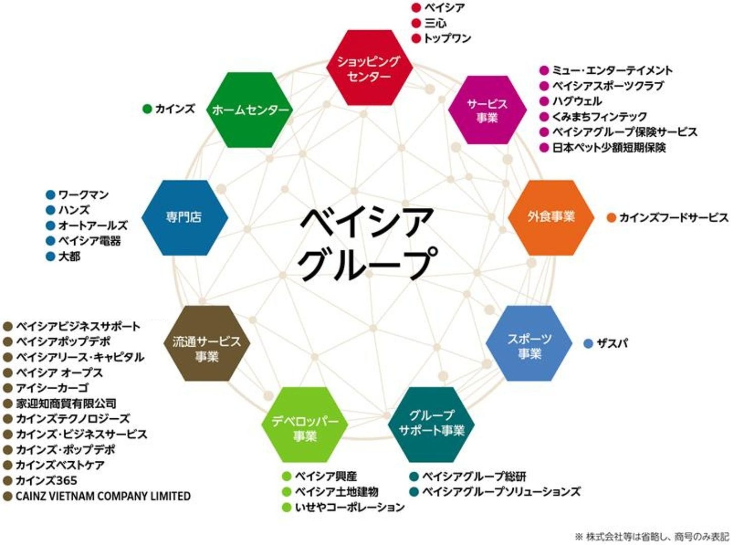 ベイシアは2019年に設立60周年を迎えたベイシアグループの中核企業です。ベイシアグループは、カインズ、ワークマンなど物販チェーン7社を中心に34社からなる企業集団で、2020年10月に「グループ売上1兆円」を達成しました。