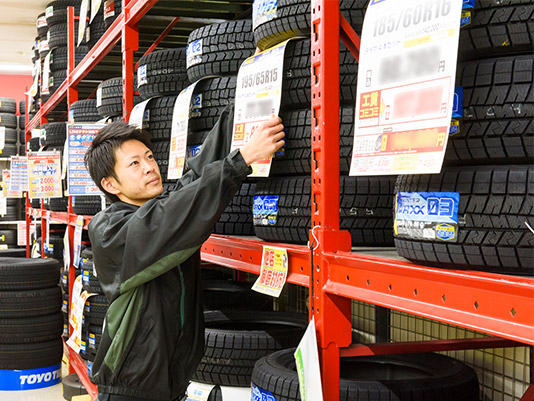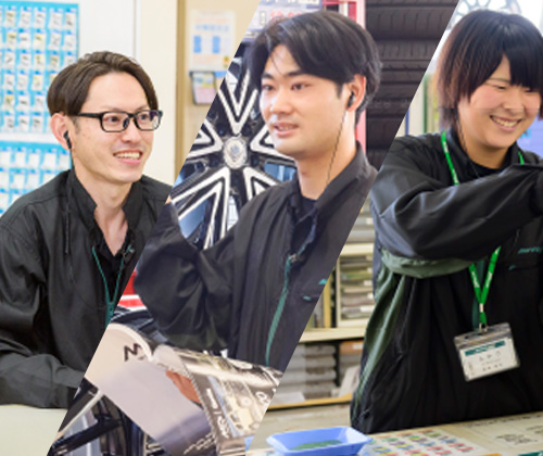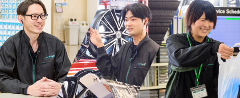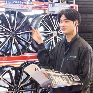車が好きでオートアールズに入社。ピットで技術を学んだ後、タイヤ販売担当を経験し、副店長として活躍中。