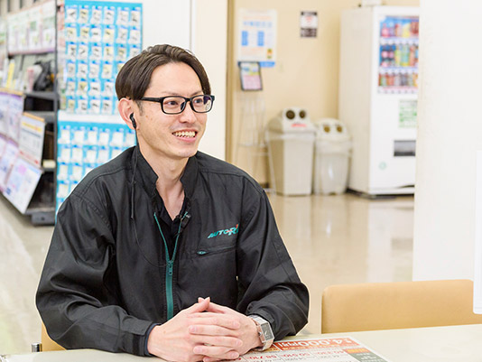 アルバイトで売場作りや発注を任され販売に興味を持ち、経営やマーケティングを大学で学び販売士資格を取得しました。家族が整備士で車に親しみがあり、よく利用していたオートアールズに入社。目標は「また来たい」と思える店づくりです。副店長の目線からチームワーク向上を目指し、目標数値の明確化や密なコミュニケーションを重視しています。